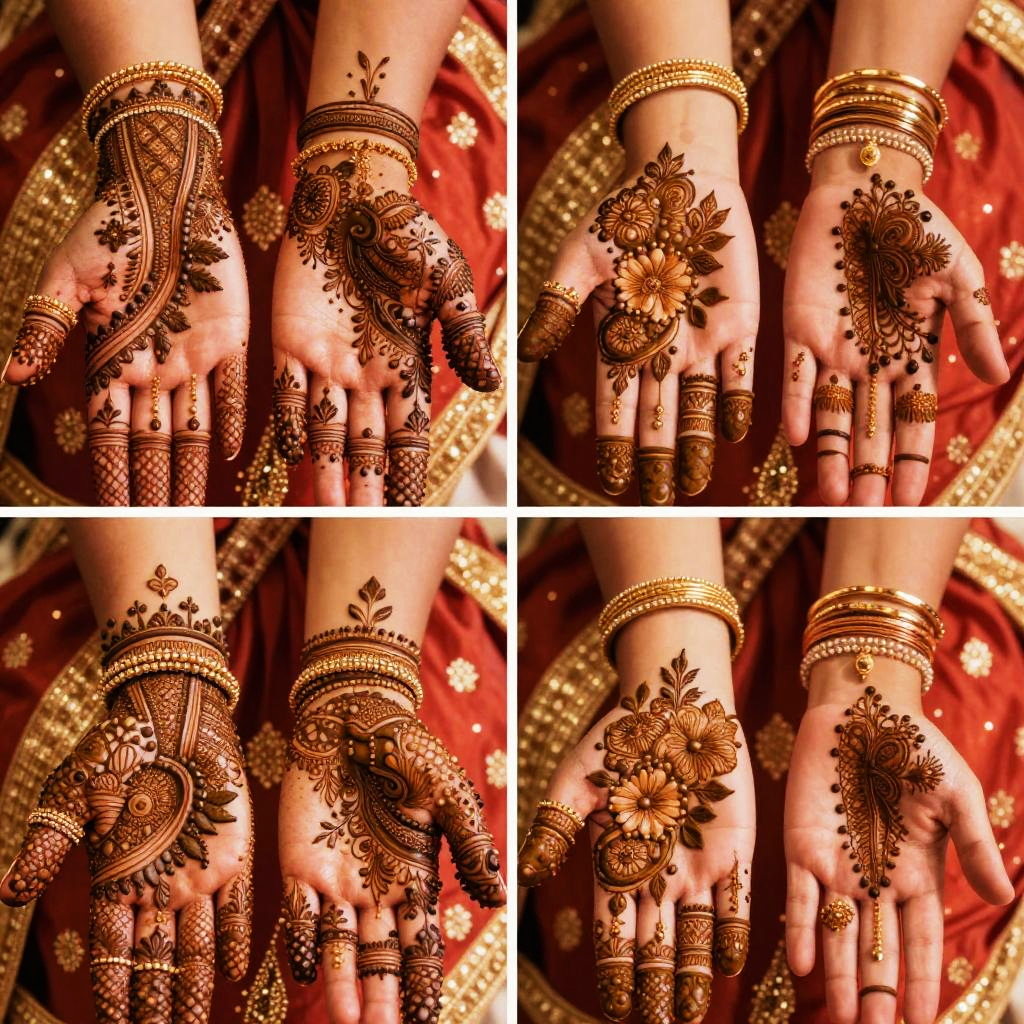 Photograph of a pair of hands with intricate henna designs covering the fingers and palms. The hands are adorned with multiple stacked bangles in various shades of red and gold. The person is holding a light-colored, patterned cloth. The henna patterns include floral and dot motifs, and the bangles have detailed engravings. The background is blurred, focusing attention on the hands and jewelry.