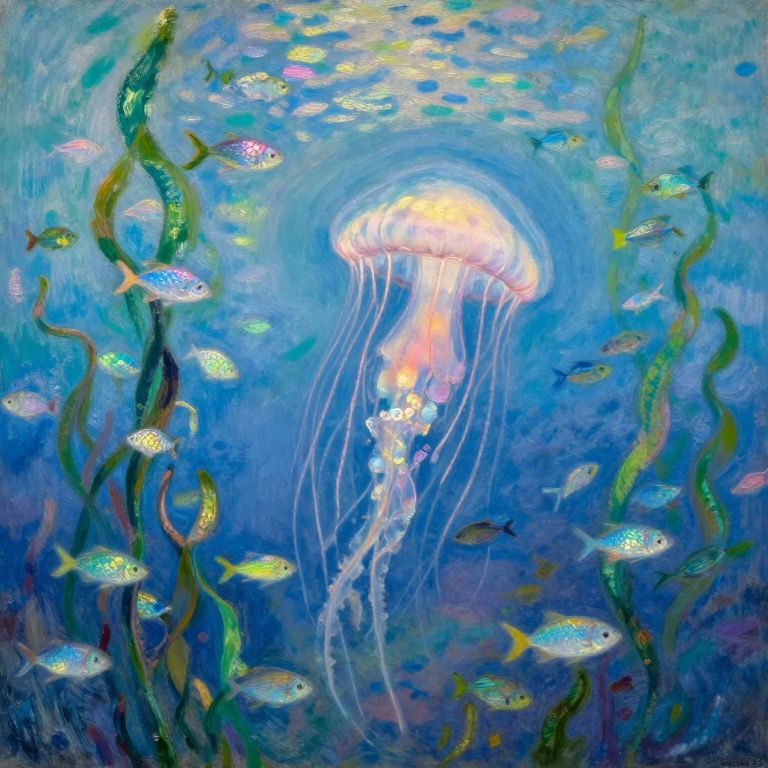Imagine an enchanting underwater scene reminiscent of Hermes Monet's captivating paintings, showcasing a serene jellyfish queen gracefully floating through a colorful coral garden. This ethereal image captures the delicate, translucent tentacles and sparkling bubbles of bioluminescent light emanating from her body as she gently moves amidst the lush hues of blooming corals and swaying seaweed. The mystical atmosphere is further enhanced by the soft, dreamy brushstrokes that blend the colors of the coral reef with the glowing aura surrounding the queen, creating an emotional gradient evoking both tranquility and wonder in this mesmerizing aquatic ballet.