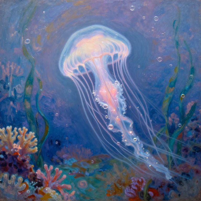 Vibrant underwater painting of a glowing jellyfish with translucent tentacles, surrounded by colorful coral and bubbles, set in a deep blue ocean.