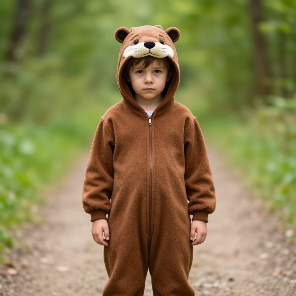 A young child, around 5 years old, is dressed in a brown furry animal costume with a hood and a hoodie, resembling a bear or a fox. The child has large, expressive blue eyes, soft skin, and a slightly mischievous smile. The costume is detailed with fur texture, stitching, and a slightly worn look, giving it a playful, homemade feel. The child is standing in a sunny backyard, looking directly at the camera with curious and innocent eyes, surrounded by a warm, natural environment with green grass, a few flowers, and a small tree in the background. The lighting is soft and golden, enhancing the cheerful and whimsical atmosphere.