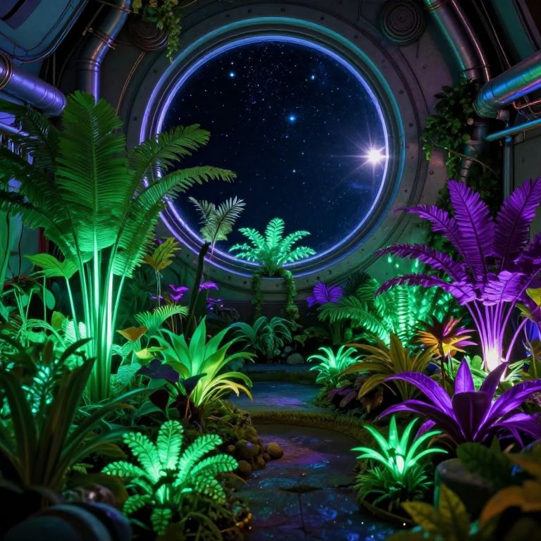 The image depicts a hyper-realistic bioluminescence meditation garden onboard a space station, with a 50mm lens capturing the scene. The garden is bathed in atmospheric, multi-colored, dynamic lighting, creating a cinematic effect. The garden features a large, circular window with a lens flare, allowing a view of the starry night sky outside. Inside the garden, a variety of plants with vibrant green and purple leaves are arranged in a lush, naturalistic manner. The plants are illuminated by bright, vertical lights, enhancing their bioluminescent qualities. The garden is enclosed within a metallic structure, with pipes and other mechanical elements visible, adding to the futuristic ambiance. The overall composition is masterfully crafted, with elements arranged in a balanced, harmonious manner, creating a sense of depth and spatial relationships. The interplay of colors, textures, and shapes creates a visually stunning and immersive experience, capturing the essence of a serene, otherworldly space garden.