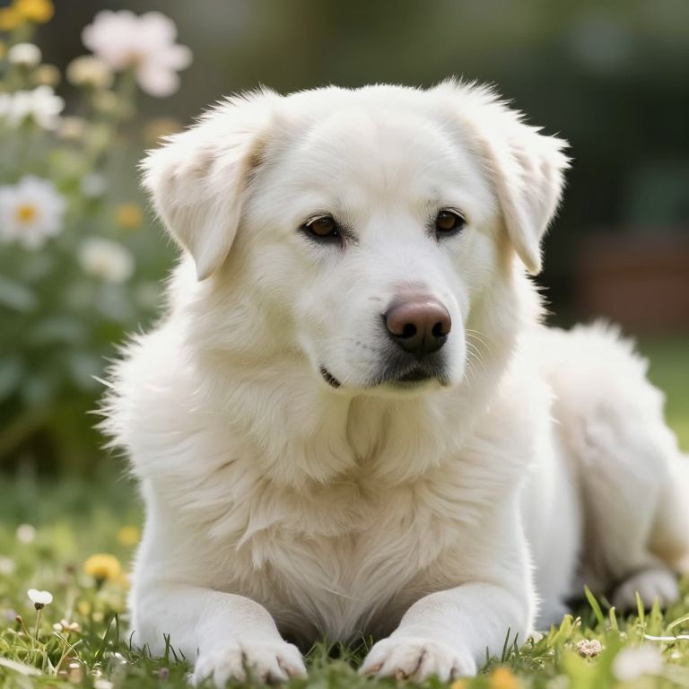 Malti dog resting in a sunlit garden, soft white fur shimmering, delicate flowers around, serene expression, close-up portrait with natural background, soft focus, warm tones, capturing the gentle and affectionate nature of the Malti breed.