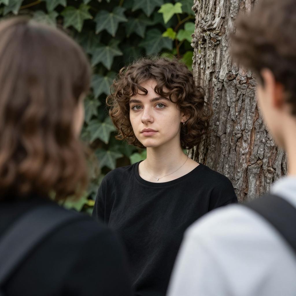 Four young adults in a dimly lit outdoor setting with dense greenery in the background. Center: blonde man with shoulder-length hair, black button-up shirt, arm around blonde woman with blue-tinted hair, black tank top, biting her finger. Right: curly-haired woman with light brown skin, denim jacket, white tank top, looking at blonde woman. Left: red-haired woman, blurred, facing group. Background: man in white shirt, partially visible.