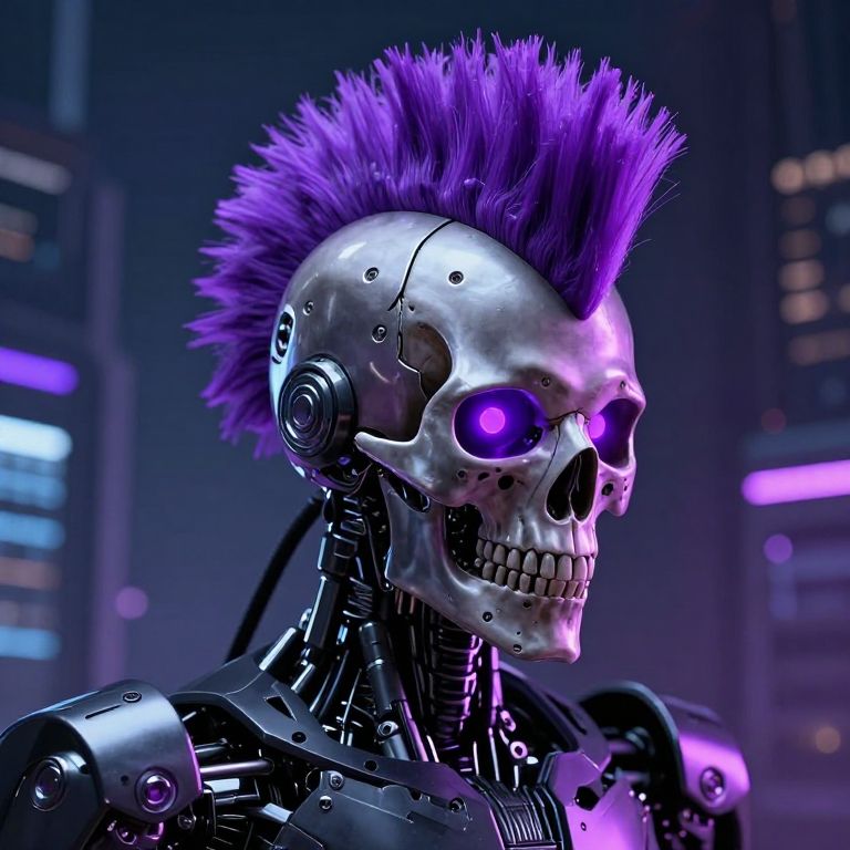 A digital CGI image of a cybernetic skeleton with a metallic skull, glowing purple eyes, and a vibrant purple mohawk. The skeleton's mechanical body is detailed with exposed wires and joints. The background features a futuristic cityscape with blurred neon lights in purple and blue hues. The image has a high-contrast, neon-lit style, emphasizing the cyberpunk aesthetic. The skeleton's expression is neutral, and the overall scene exudes a sci-fi, dystopian vibe.
