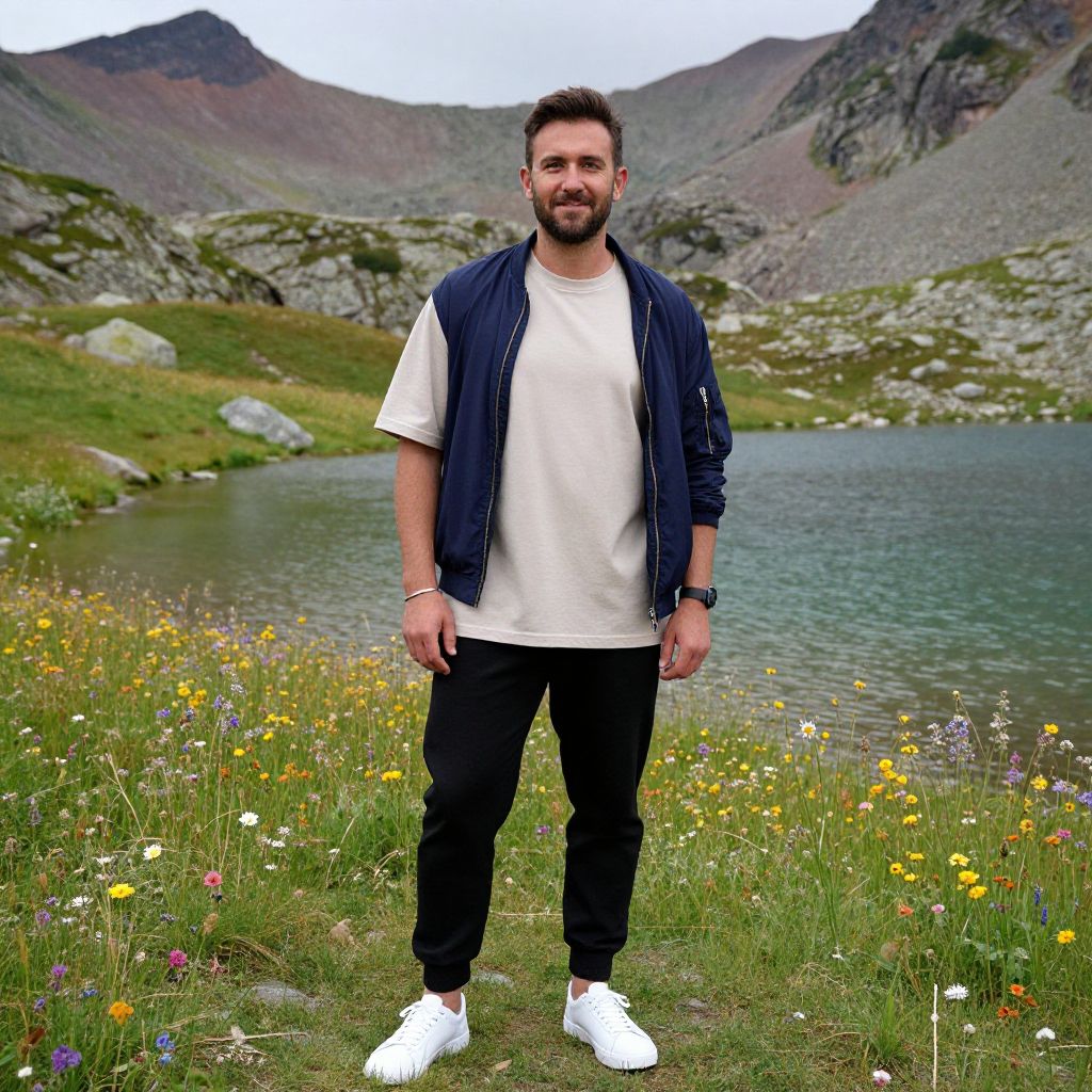 A man, light beige oversized cotton t-shirt, tailored black joggers, white minimalist sneakers, lightweight navy bomber jacket, simple silver cuff bracelet, vibrant wildflower meadows, crystal-clear alpine lakes, rugged rocky outcrops, ib technicolor film stock, relaxed smile, enjoying the scenery.Man has masculine face and piercing eyes