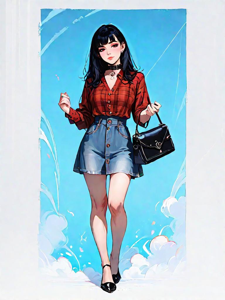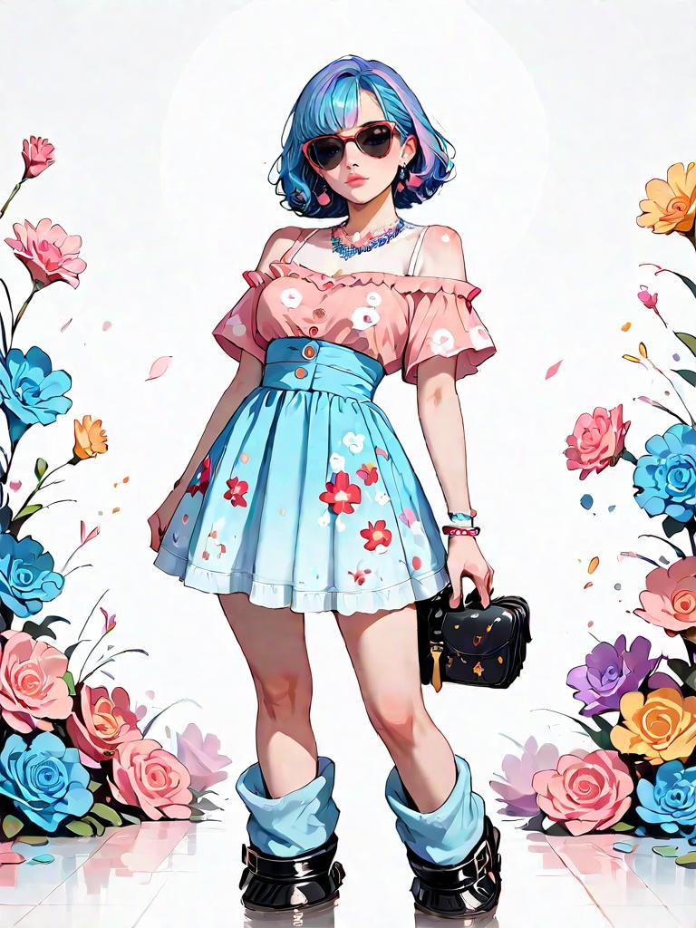 Realistic illustration of a young woman with short white hair standing in front of a dark green door. She wears a white off-the-shoulder mini dress with vibrant pink floral print, ruffled hemline, and cinched waist. The outfit is paired with tan ankle boots, a fringed crossbody bag, layered beaded necklaces, and oversized sunglasses resting on her head. She stands on tiled steps framed by potted plants, in an urban outdoor setting.
