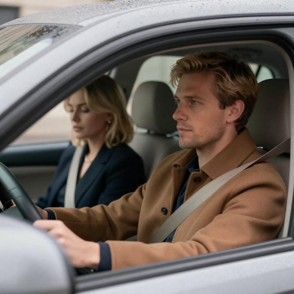 Photograph of a man with wavy brown hair and a leather jacket driving a car, with a smiling woman with brown hair and a brown coat leaning on his shoulder from the passenger seat. Bright daylight streams through the car windows.