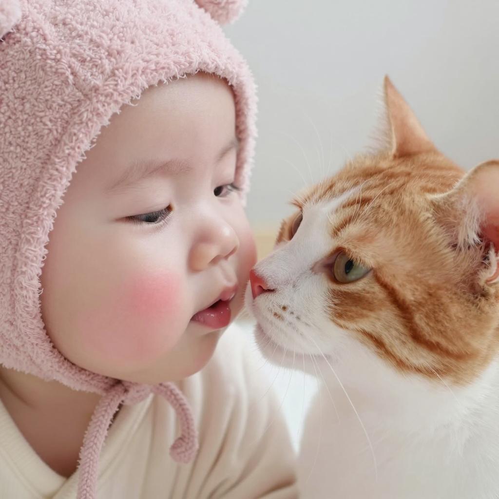 Young girl with light brown curly hair and fair skin, wearing a white short-sleeve shirt, sleeping on a pink pillow with white circles, hugging a white cat with closed eyes. Cat's face shows a relaxed expression. Pink pillow in background.