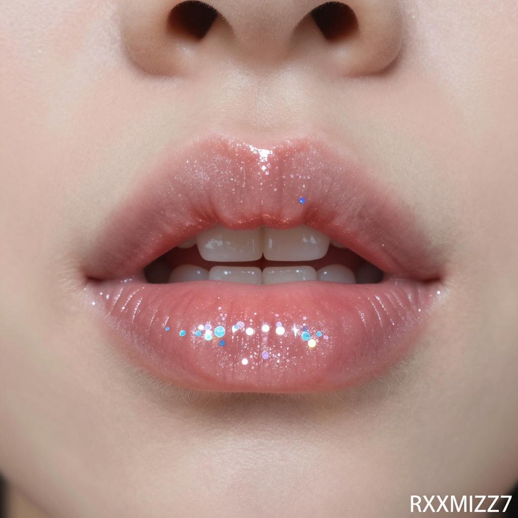Close-up of pink lips with pastel-colored star, heart, and butterfly-shaped glitter on the upper and lower lips. Glitter is shiny and reflective. Lips are full and slightly parted. Skin around the lips is light and smooth.