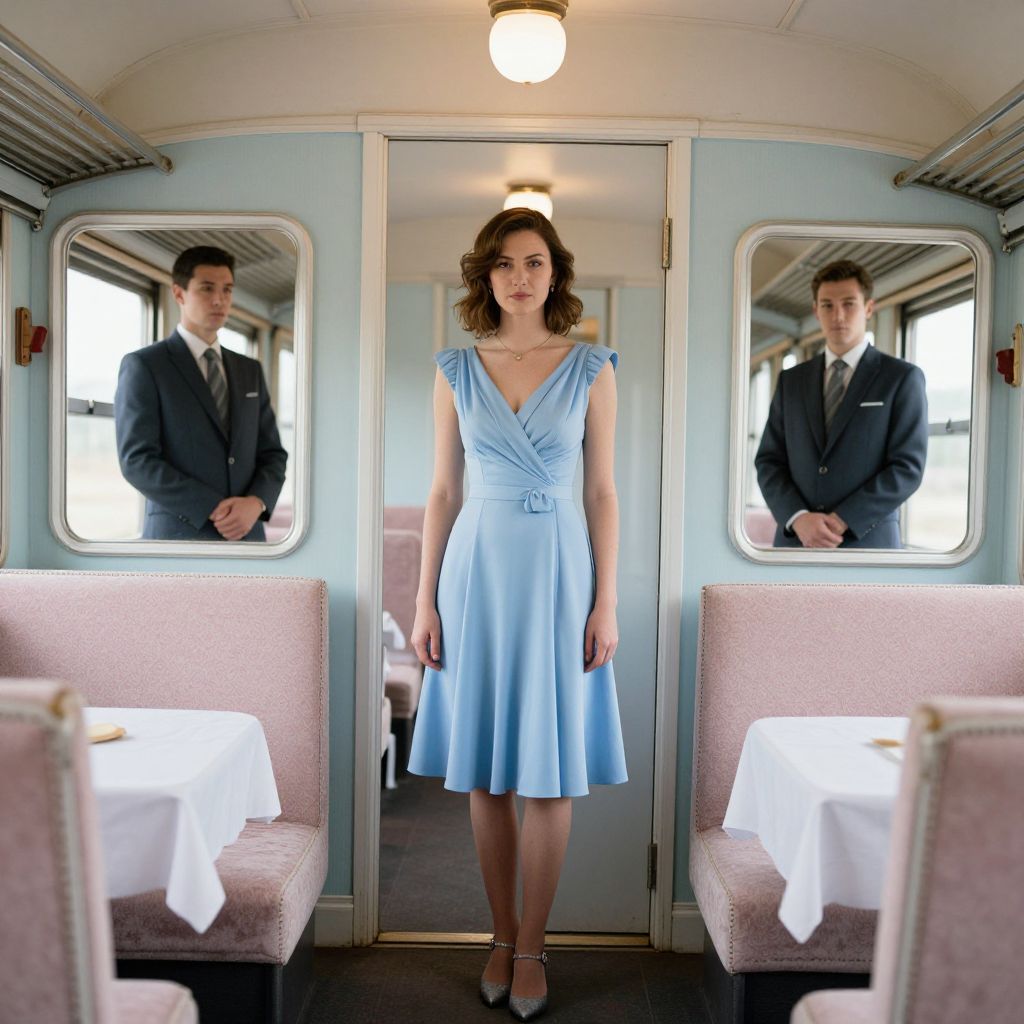 Photograph of a vintage train carriage. A white woman with wavy brown hair, wearing a light blue, sleeveless, knee-length dress with a V-neck and small bow at the waist, stands in the center. Her reflection is visible in two rectangular windows on either side. Flanking her are pink upholstered seats with white tablecloths. A man in a dark suit and white shirt stands in each reflection, both looking forward. The carriage's light blue walls and overhead light create a soft, nostalgic ambiance. The image has a clean, polished look with bright, even lighting.
