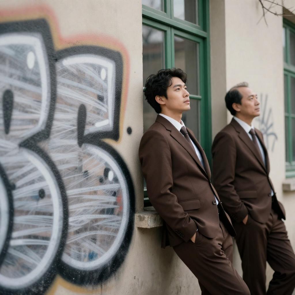 Two Men in Brown Suits Behind Graffiti