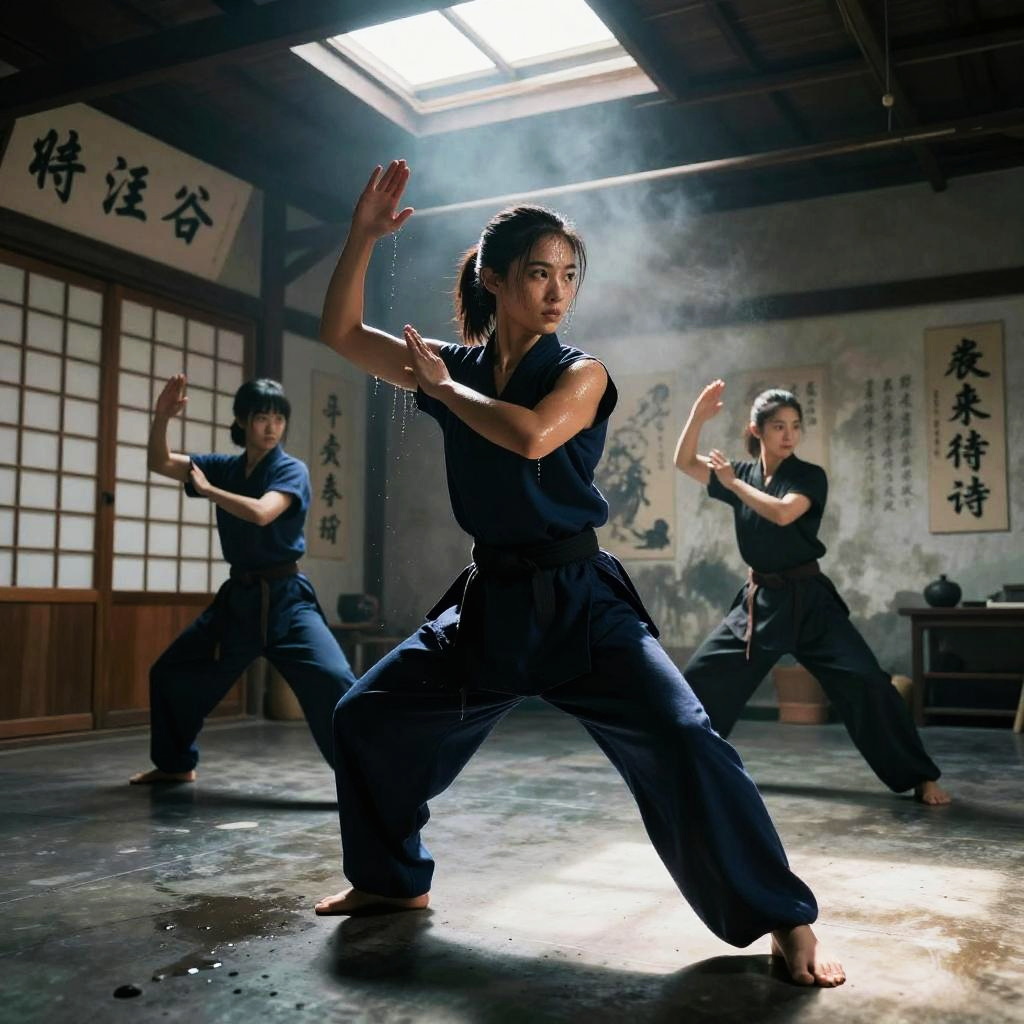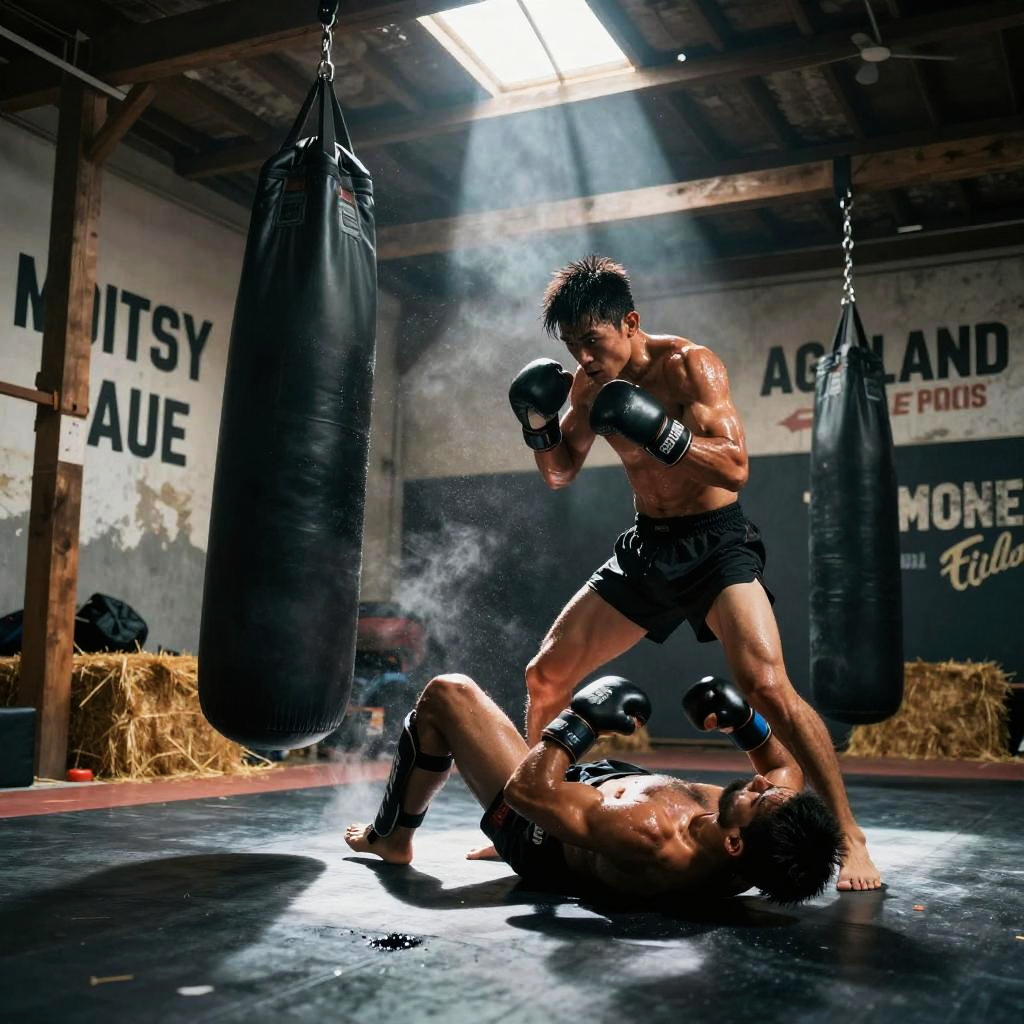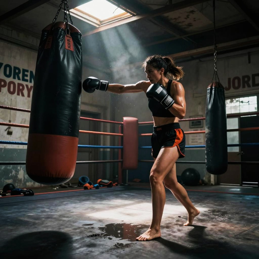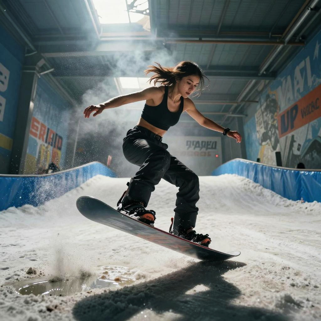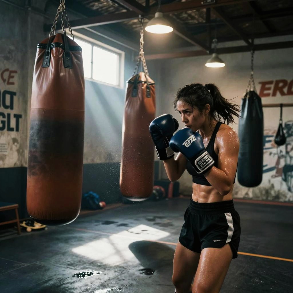 Carlos, a track sprinter training in underground sports tunnel with reflective wet floors, focused on starting block sprints, resistance band runs, sweat dripping, gritty atmosphere, motivational slogans on battered walls, chalk dust hanging in the air, puddles on concrete, shafts of light through a leaky roof, soft haze and dynamic motion blur, high contrast and deep shadows, hyper-detailed musculature, determined stare, cinematic lighting, bold composition, low-angle hero shot, echoing clanks, relentless energy, subtle film grain, moody blue-orange color grade, epic athletic intensity
