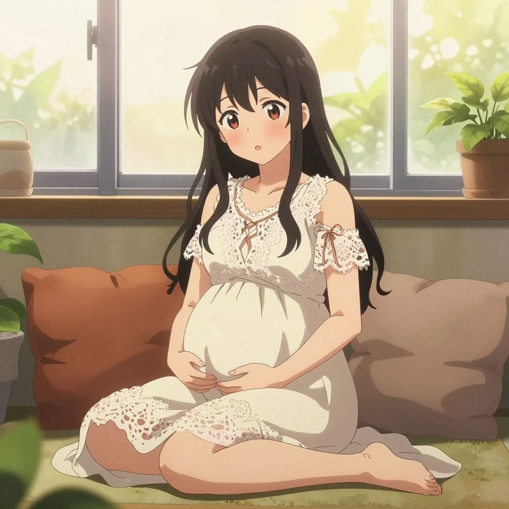 Anime girl pregnant sitting by a window in a cozy room, warm ambient light, subtle blush on her cheeks, wearing a flowing dress with intricate lace, surrounded by soft pillows and plants, capturing a calm and nurturing atmosphere in vibrant anime illustration style.