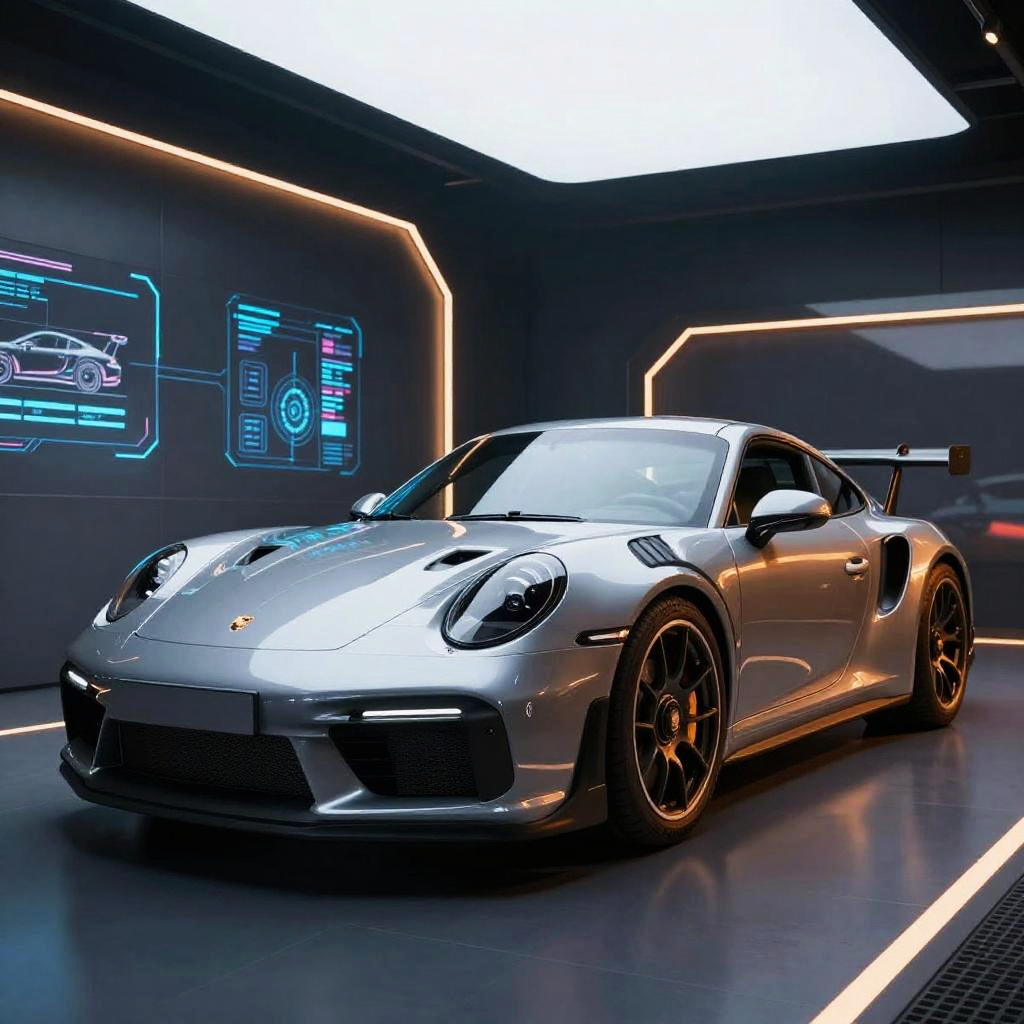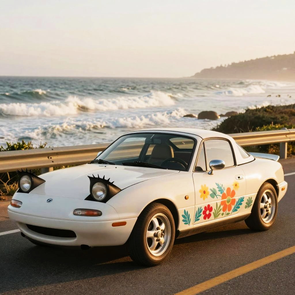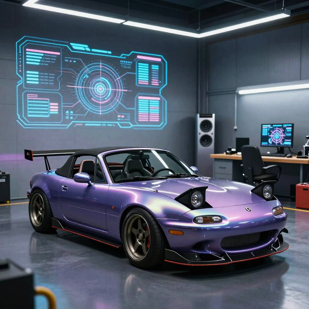 GTA Miata showcased in a futuristic garage with holographic interface panels, chromatic lighting highlighting custom body kit and performance upgrades, sleek metallic finishes, cyber-enhanced automotive workshop, blending high-tech design with classic roadster elements.