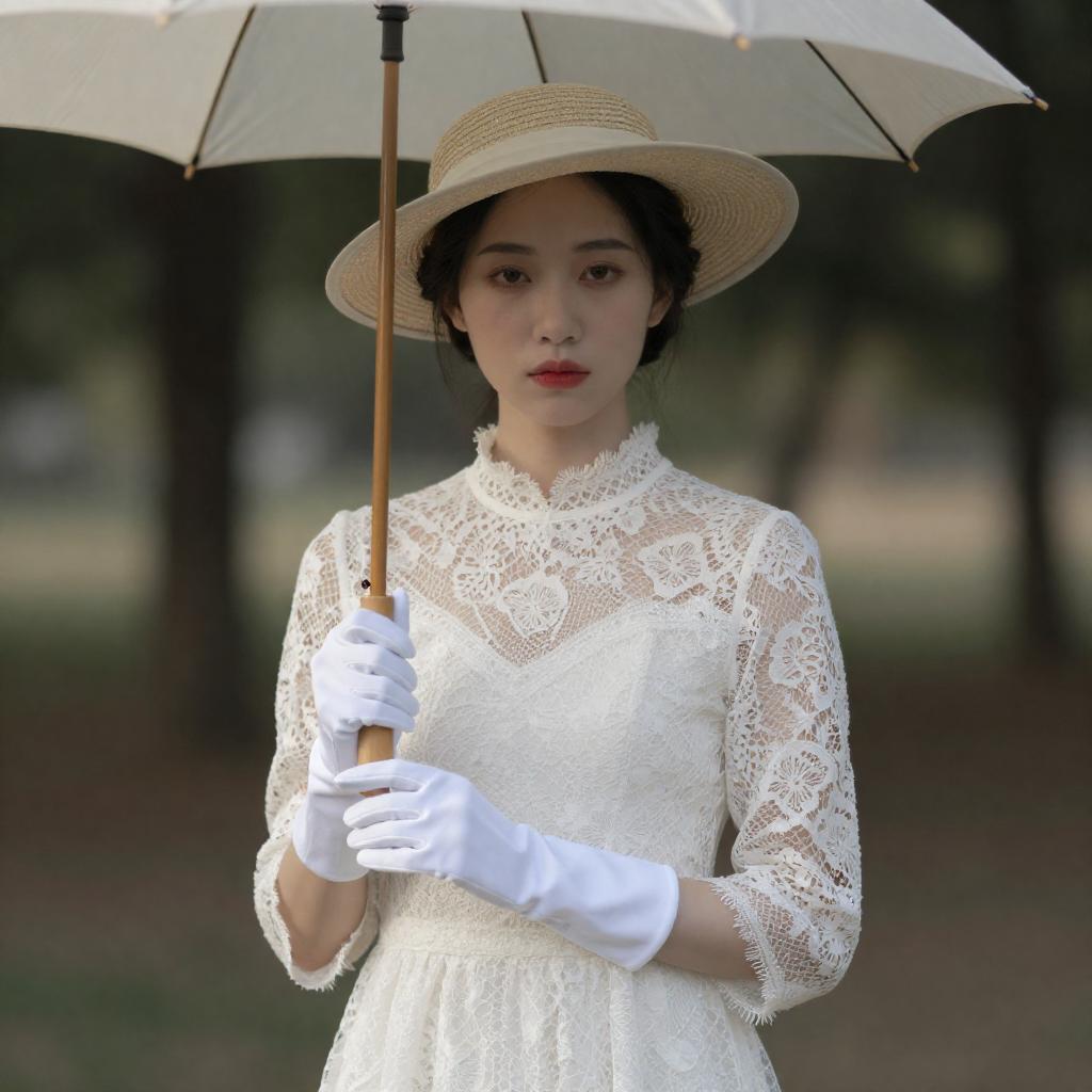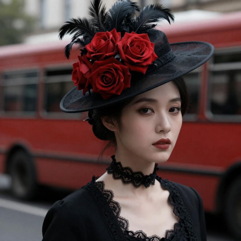 Portrait of a pale-skinned woman wearing a large black hat decorated with red roses and black feathers. She has dark eyes, wears a black lace choker and dress, and poses with a serious expression. The background features a blurred red bus, creating an urban setting with a vintage, high-contrast style.