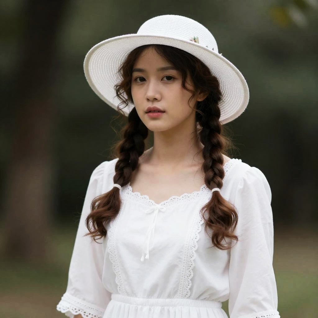 Photograph of a pale-skinned woman with dark eyes, wearing a black lace choker and a large, elaborate black hat adorned with red roses and black feathers. She gazes slightly to the side with a serious expression. A blurred red bus is in the background. The image has a high-contrast, slightly grainy ure.