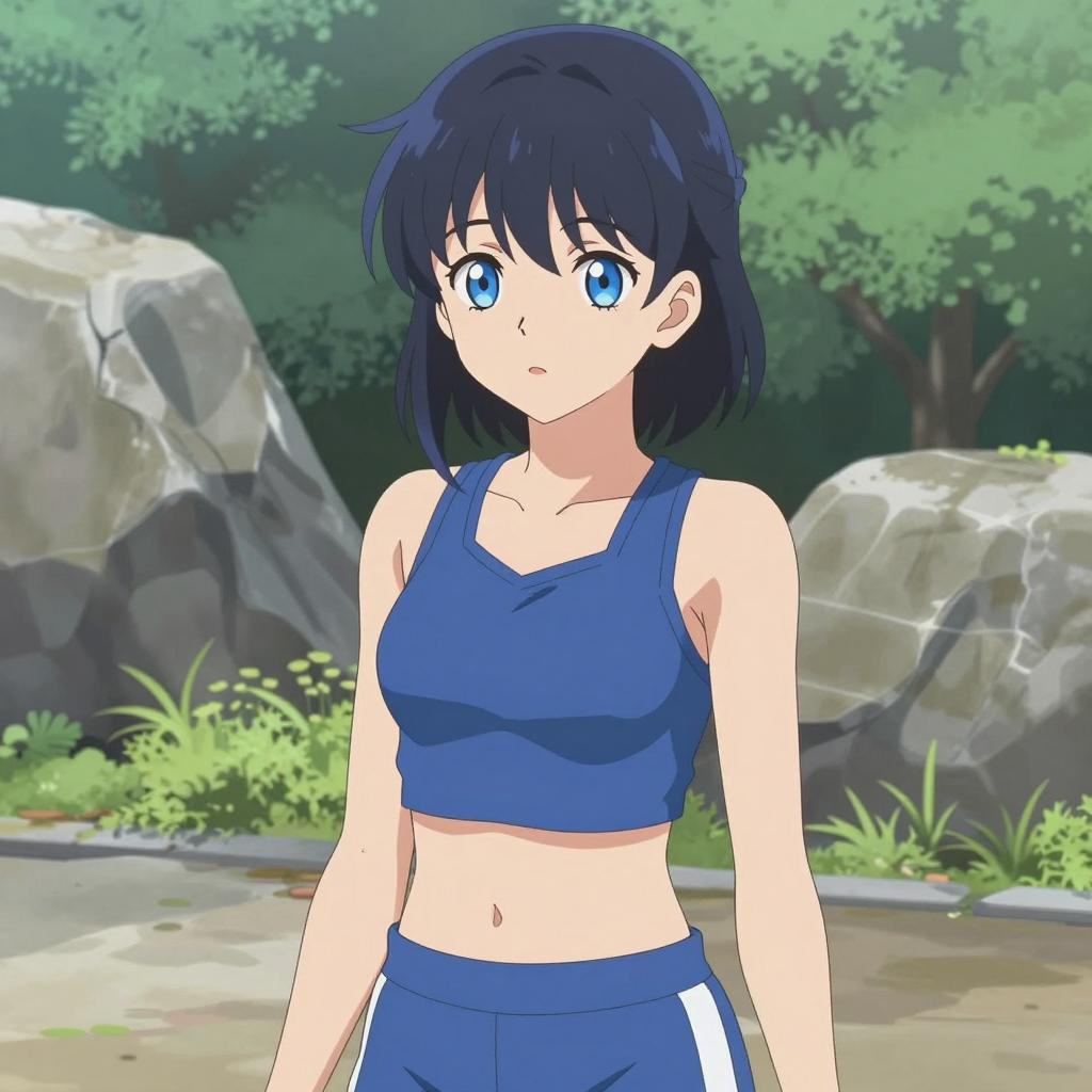 A young woman with dark blue hair and blue eyes wearing a sporty blue outfit, standing outdoors near rocks and greenery in bright sunlight, anime style, vibrant colors, smooth shading