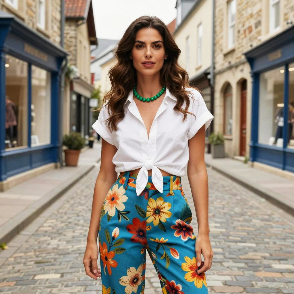 Photograph of a confident woman standing on a cobblestone street in a quaint, narrow town with stone buildings. She has wavy brown hair, olive skin, and wears a white, tied-up short-sleeve shirt, paired with vibrant, floral-patterned high-waisted pants. A green beaded necklace complements her outfit. The background features narrow streets with blue shopfronts and traditional architecture. The overall vibe is stylish and urban-chic.