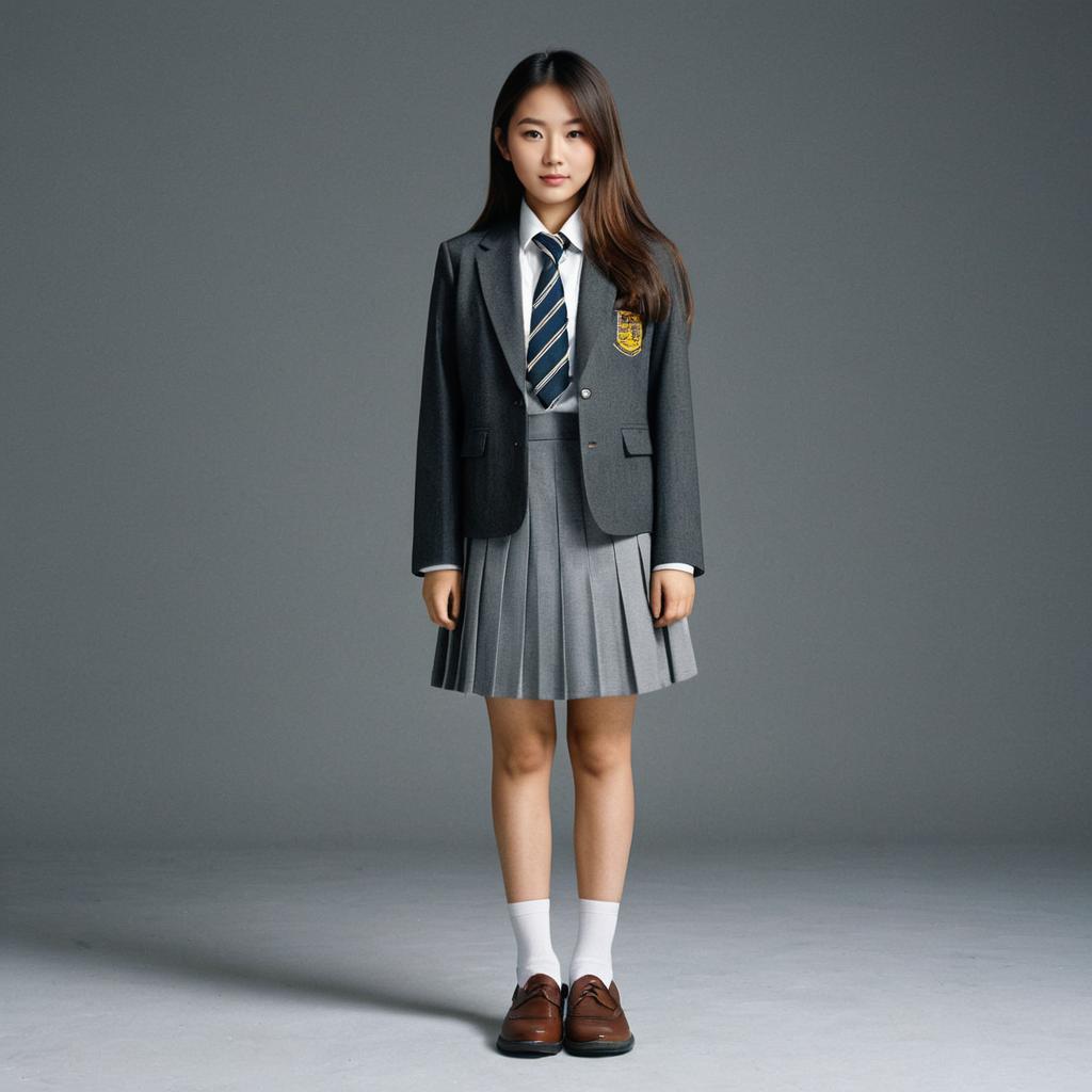 Cho chang harry potter,1girl, solo, realistic, necktie, long hair, looking at viewer, blurry background, brown hair, necklace, outdoors, brown eyes, closed mouth, robe, blurry, asian, school uniform, jewelry, long sleeves, cross, white shirt, standing, shirt, collared shirt