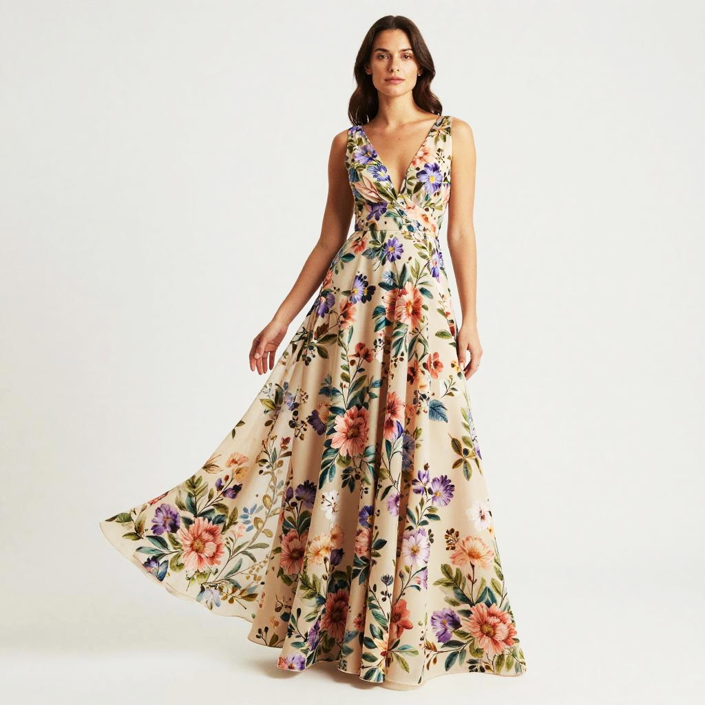 A graceful woman models a stunning floral gown, showcasing intricate embroidery in soft pastel colors. The elegant dress flows beautifully, accentuating her poise and charm, making it perfect for special occasions or formal events.