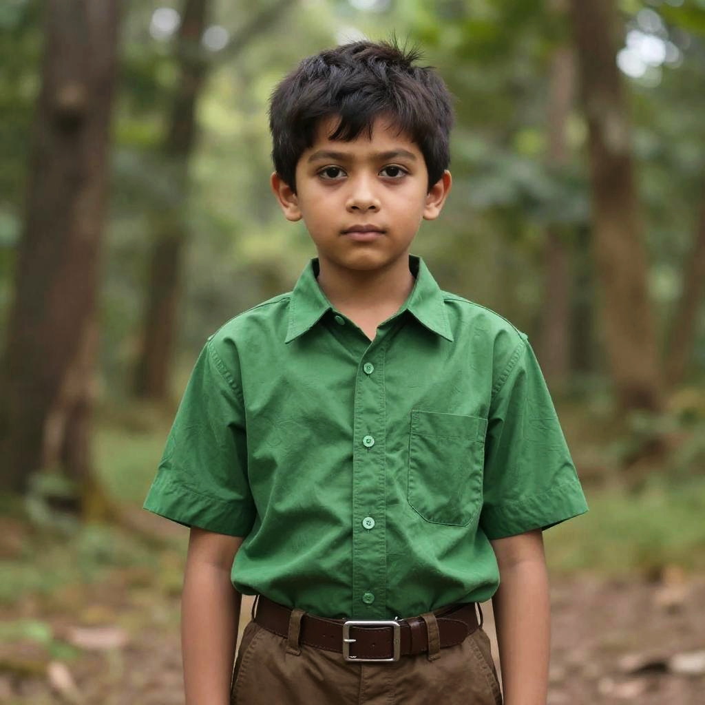 Photograph of a young Indian boy with short black hair, wearing a green short-sleeved shirt and brown pants, standing in a forest with blurred