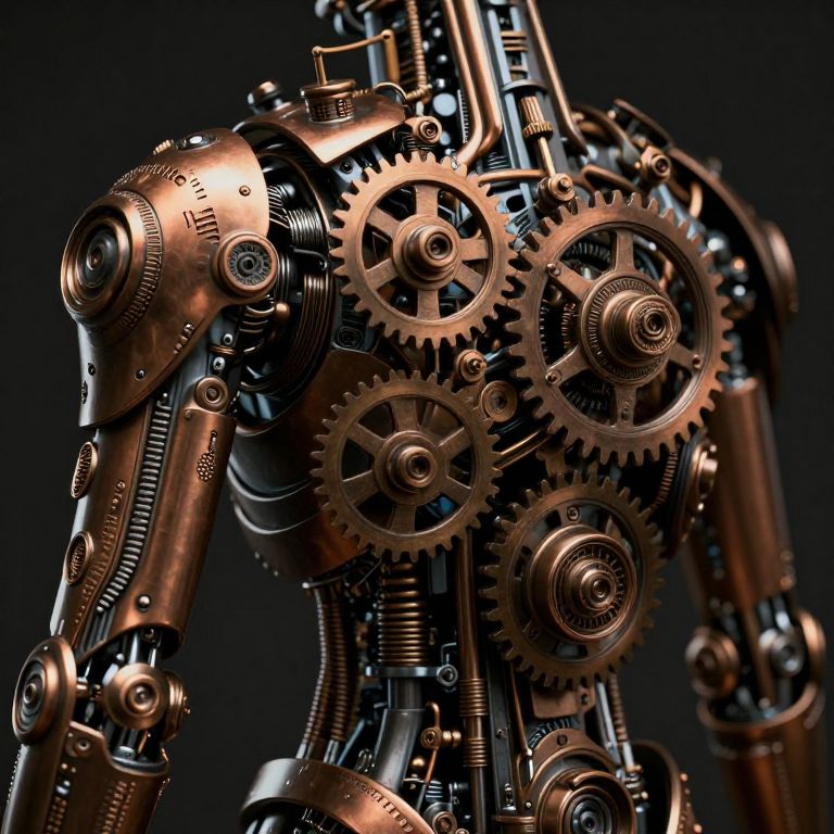 A close-up of Nipslio as an intricate mechanical invention, gears and circuits intertwined with organic elements, against a dark background, highlighting steampunk aesthetics with rich textures and bronze tones.