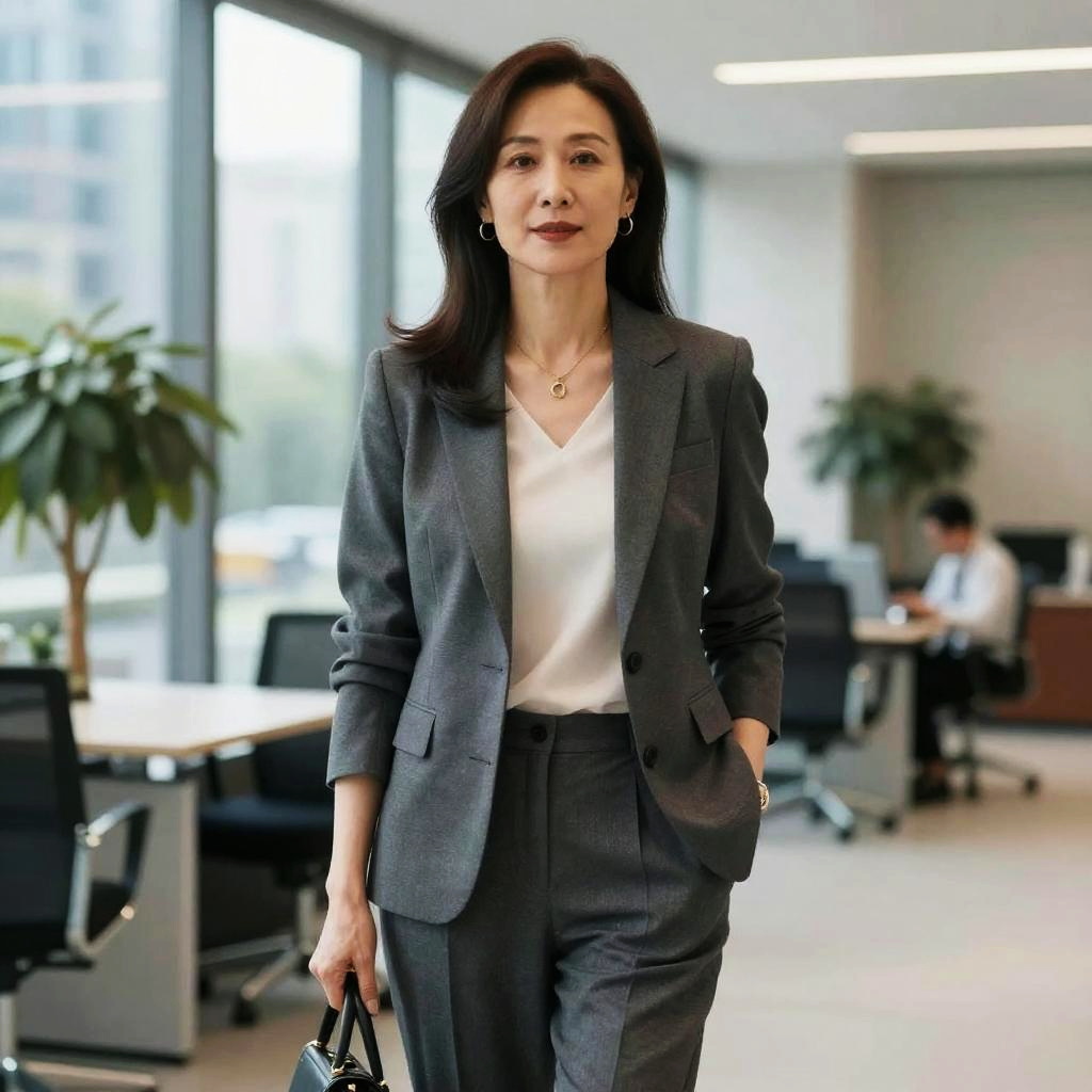 Peekaboo Fringe hairstyle on middle aged woman, wearing elegant silk scarf and blouse, in luxurious hotel lobby, captured in fashion editorial style with warm ambient chandelier glow.