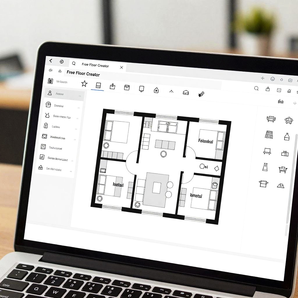 Close-up of a free floor plan creator software screen on a laptop, filled with custom room shapes and icons for doors, windows, and furniture, sleek professional design, high resolution with clean vectors, realistic office background blurred softly to highlight screen details.