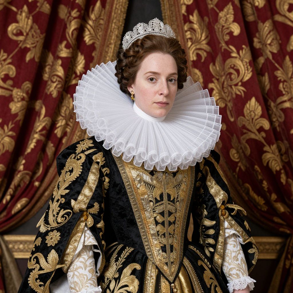 Elizabethan-era regal attire featuring a woman in a richly embroidered black gown with gold accents, a voluminous white ruff collar, and a tiara, set against a backdrop of ornate red curtains with golden patterns.