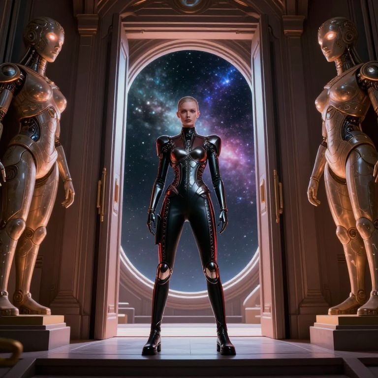 In this captivating image, a humanoid figure, adorned in a sleek, form-fitting Gucci designer outfit, stands confidently in a grand, futuristic doorway. The figure's attire is a striking contrast of dark and metallic hues, accentuated by intricate detailing that hints at advanced technology. The doorway itself is a marvel of design, featuring a large, circular window that reveals a breathtaking view of a starry, nebula-filled sky, suggesting a connection to the Metaverse or a parallel universe. Flanking the doorway are two large, humanoid statues, their faces illuminated by a soft, quantum light that casts a warm glow on the scene. The statues, with their intricate mechanical features and glowing eyes, add a sense of mystery and otherworldliness to the setting. The overall composition is balanced, with the figure, doorway, and statues creating a harmonious interplay of shapes and colors, all set against a backdrop of deep, rich tones that enhance the sense of depth and dimension.