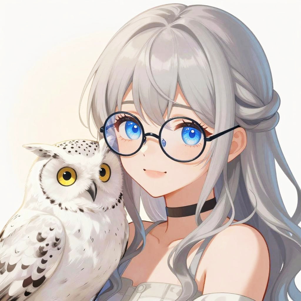 This digital anime-style drawing features a young woman with long, wavy silver hair and large, expressive blue eyes, wearing round glasses. She's smiling gently while a white owl with yellow eyes and black speckles nuzzles her cheek. The background is a soft gradient, highlighting the subjects. The owl's feathers are detailed, and the woman's delicate features are accentuated by soft lighting.