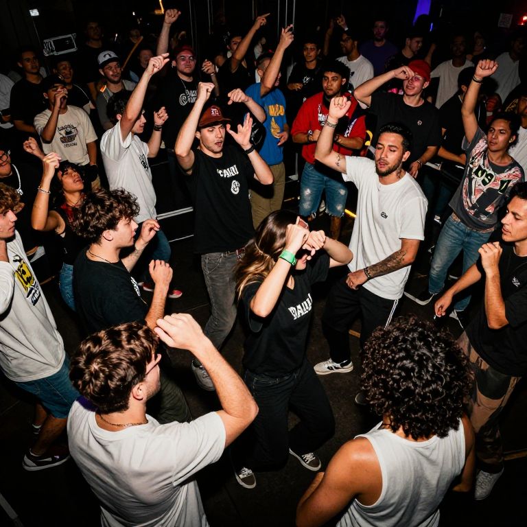 A chaotic mosh pit at a hip hop concert, viewed from above, with a crowd of people engaged in energetic dancing and movement.