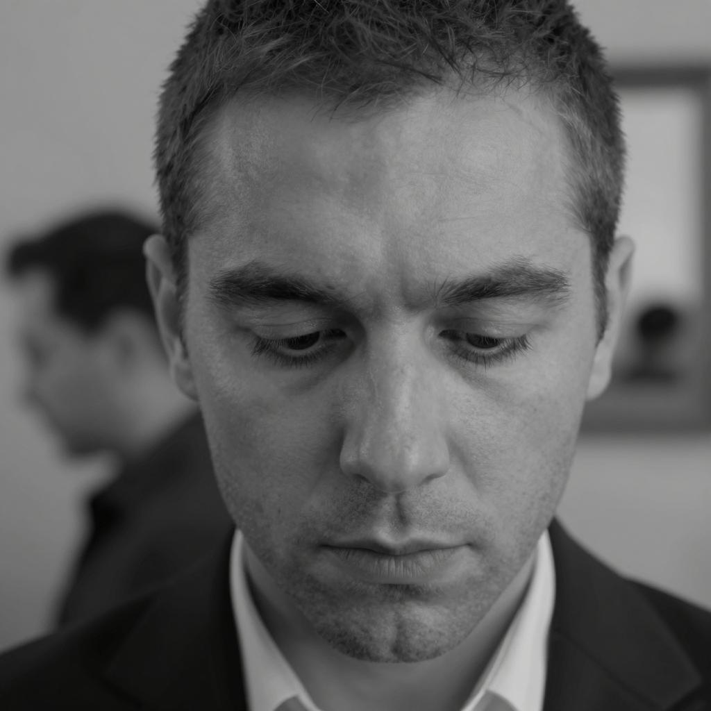 Close-up of a man with a shadow over his right eye, brown hair, and slight beard. He has a serious expression and is wearing a dark jacket. Background is blurry with indistinct objects. Dim lighting. One visible eye is brown. The man is in the right half of the frame.
