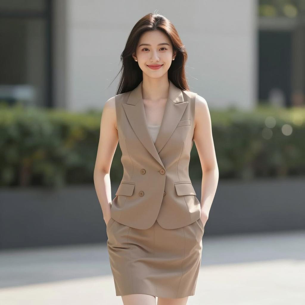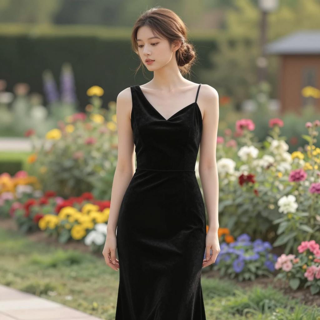 Woman evening clothes, photorealistic portrait of a young Asian woman with fair skin and brown hair in a half-up, half-down style, wearing a one-shoulder pink and black dress with lace detailing, black choker with gold ring, natural makeup with red lipstick, standing in a sunlit urban street, soft focus background, elegant and stylish, subtle sunlight, daytime, fashionable, confident expression, medium shot