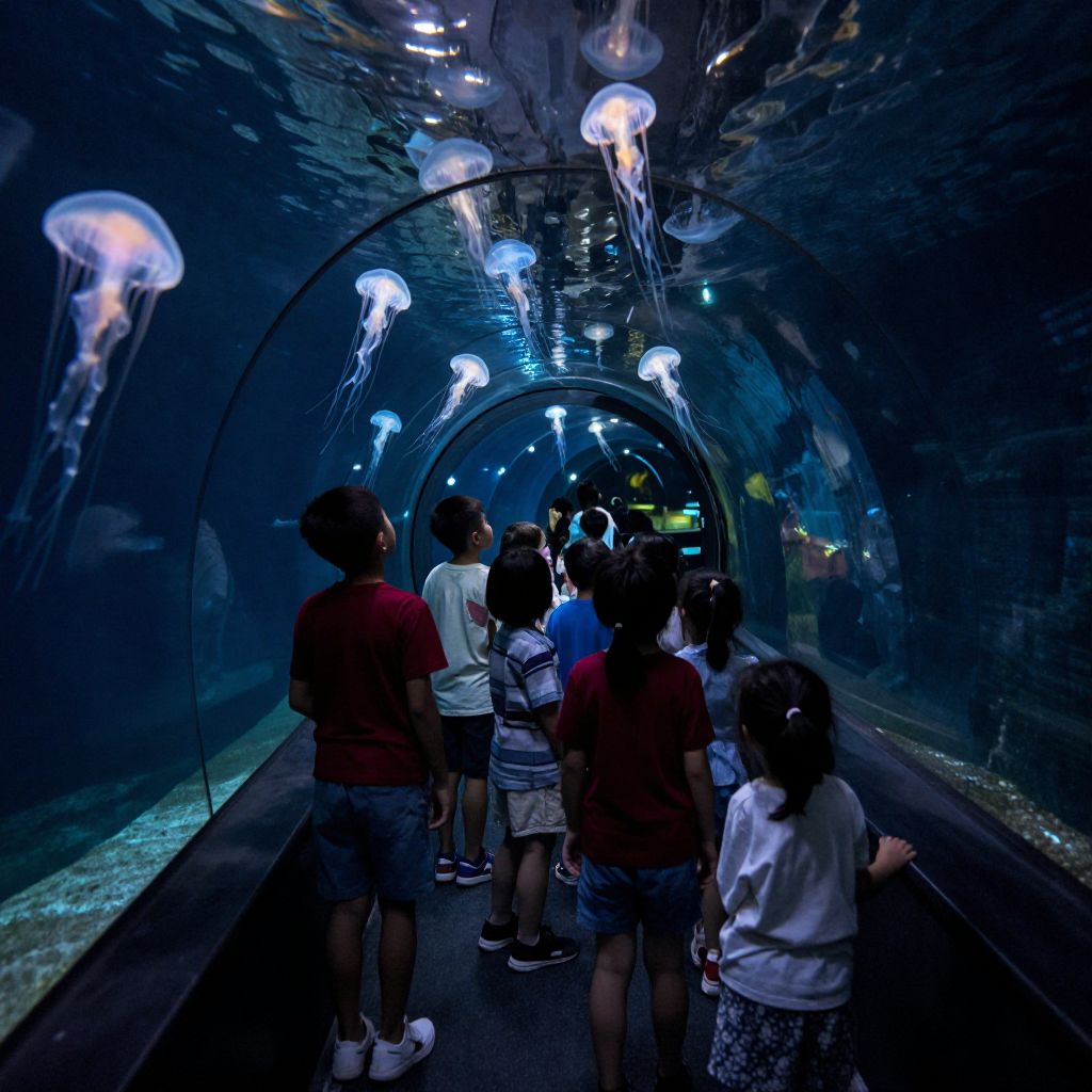 Children stand in awe as they navigate a serene underwater tunnel illuminated by numerous glowing jellyfish, their translucent bodies casting ethereal light against the dark, textured walls.