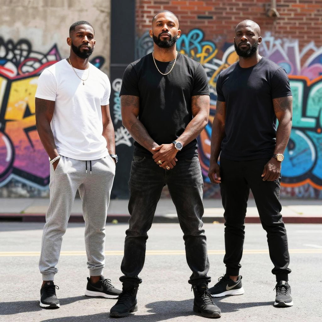 Big black men standing confidently in urban streetwear, vibrant city background with graffiti walls, dynamic lighting highlighting strong physiques, modern and stylish atmosphere, realistic detailed portrait, mid-day sunny setting