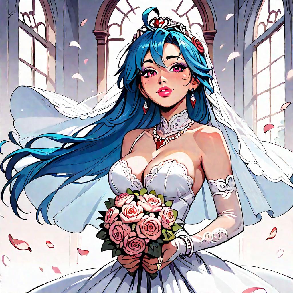 Digital anime-style bride with long blue hair, blue eyes, white lace gown, floral headpiece, veil, holding white roses, sunlight filtering through vines