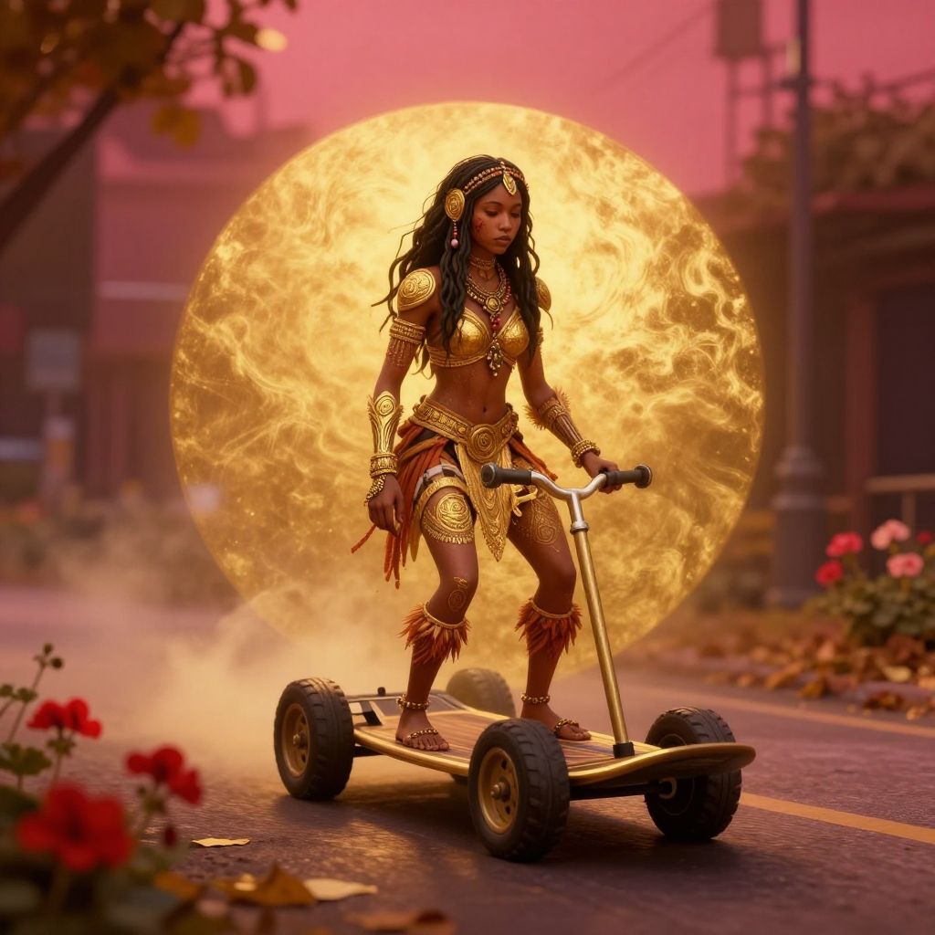 Photorealistic digital art of a dark-skinned woman with long black hair riding a scooter, wearing tribal armor, against a giant glowing orange moon in