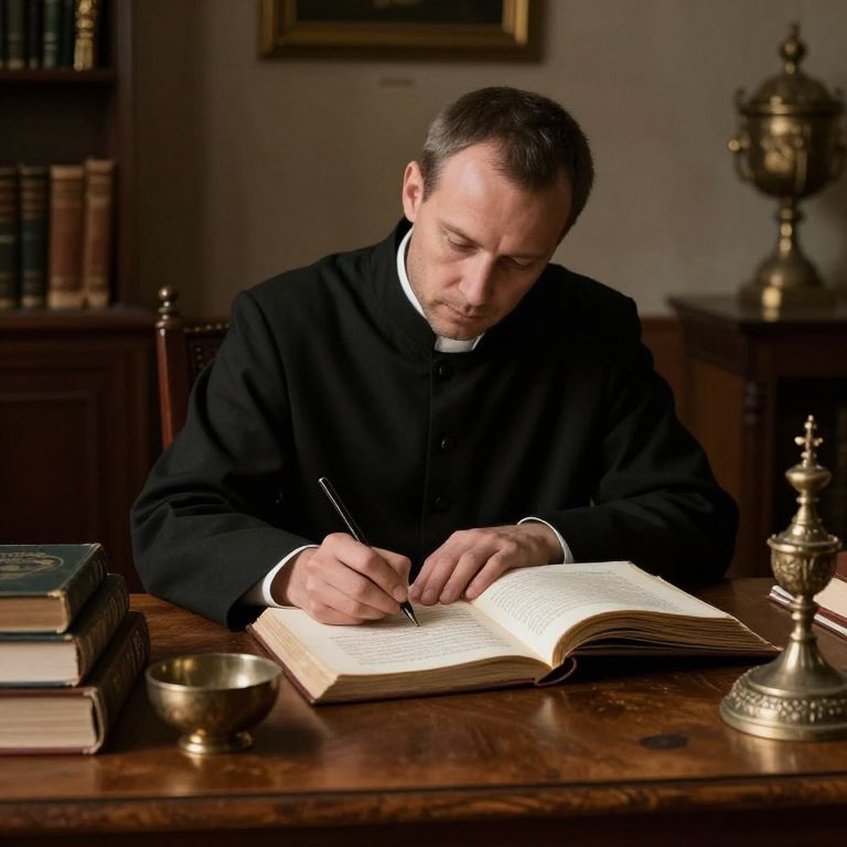 Priest engrossed in study, seated at a wooden desk in a dimly lit room, meticulously writing in an open manuscript while surrounded by stacked books, a small bowl, and ornate religious artifacts.