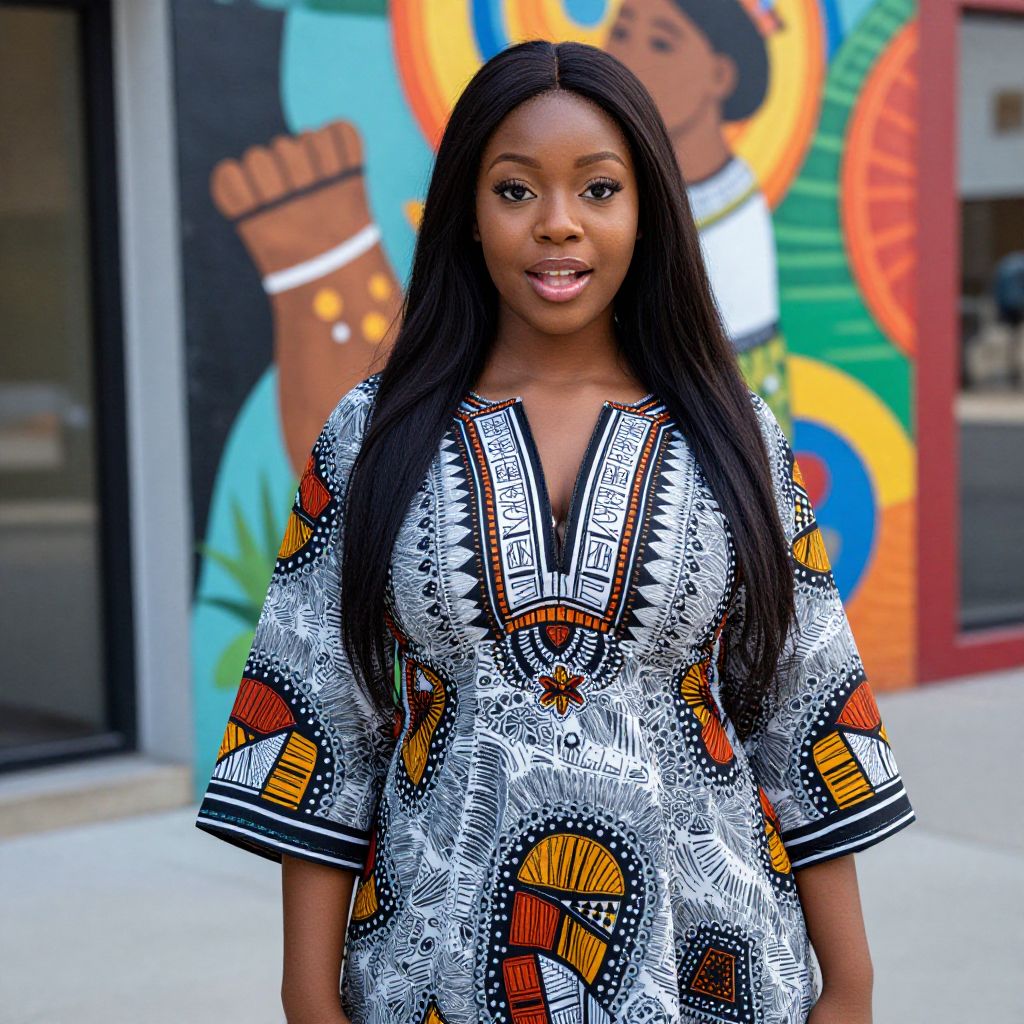 Photograph of an attractive Black woman with long straight black hair, wearing a vibrant, patterned African-inspired dress, standing in front of colorful urban mural
