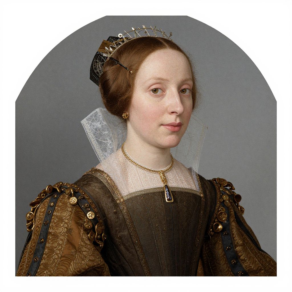 This is a detailed, Renaissance-style digital portrait of a fair-skinned woman with brown hair styled in a neat bun, adorned with a jeweled headpiece. She wears a black, intricately embroidered dress with puffed, brown velvet sleeves embellished with gold buttons. A sheer white lace collar and a delicate, transparent lace veil are visible around her neck. She also wears a gold necklace with a pendant. The background is a simple, solid gray, highlighting her elegant attire and calm, slightly smiling expression. The portrait has an arched top border, typical of traditional Renaissance portraiture.