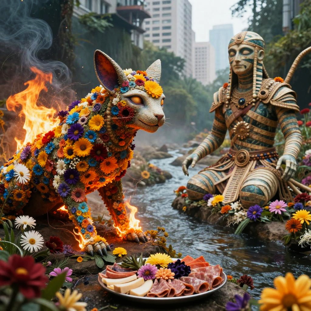 Realistic photo.Soundtrack in fire, explosion flowers, phyto-linked photosynthetic sphinx, warrior mummy, made of flowers, acherons river to purgatory, formless deity amidst the floral mist, berghain underworld, floral charcuterie, empathetic pigment, thriving eco-system, nebulous thread, homogenic, threads of decay, intense, particles, ancient style armor, eyes half closed, mysterious face, gentle smile, photorealistic, hyperrealistic, many details, precise graphics, perfect shot, big city in the background. realistic photo