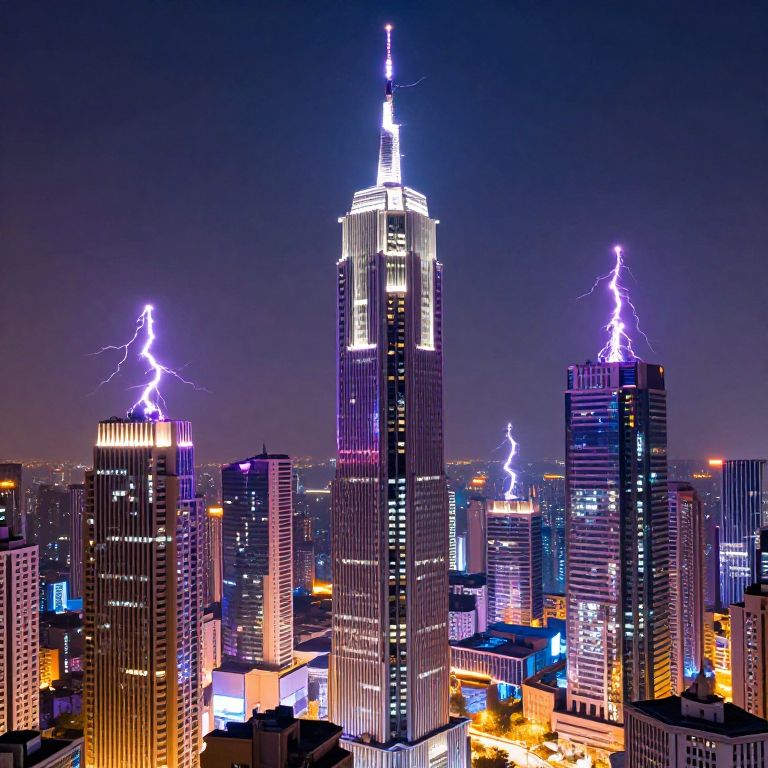 Futuristic cityscape featuring multiple blitzableiters atop skyscrapers, each glowing faintly with electric energy as lightning forks around them, blending sci-fi aesthetics with modern urban architecture, vivid colors and dramatic contrasts.