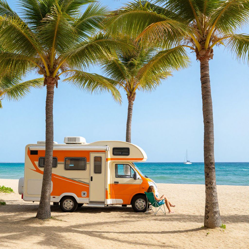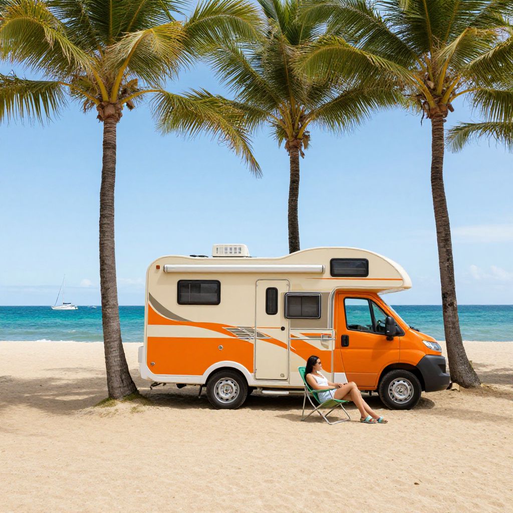 Photograph of an orange and white RV parked on a sandy beach with palm trees, blue ocean, and clear sky. A person sits in a green