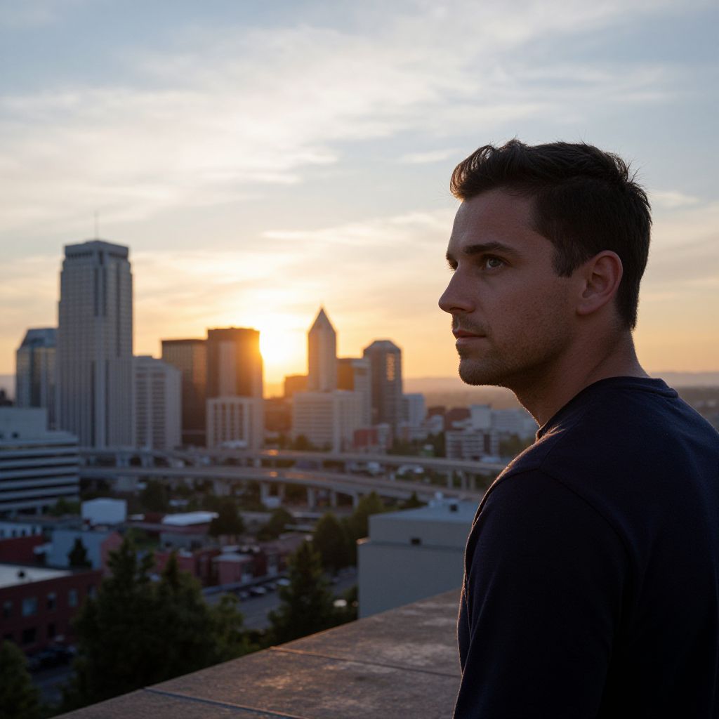 Captivating portrait of a man standing on a rooftop, gazing out at the breathtaking Portland skyline as the sun sets behind him, casting warm golden hues across the cityscape, with tall buildings and bridges stretching towards the horizon, framed by a serene sky filled with wispy clouds, captured in crisp high-resolution digital photography. Man has masculine face and piercing eyes