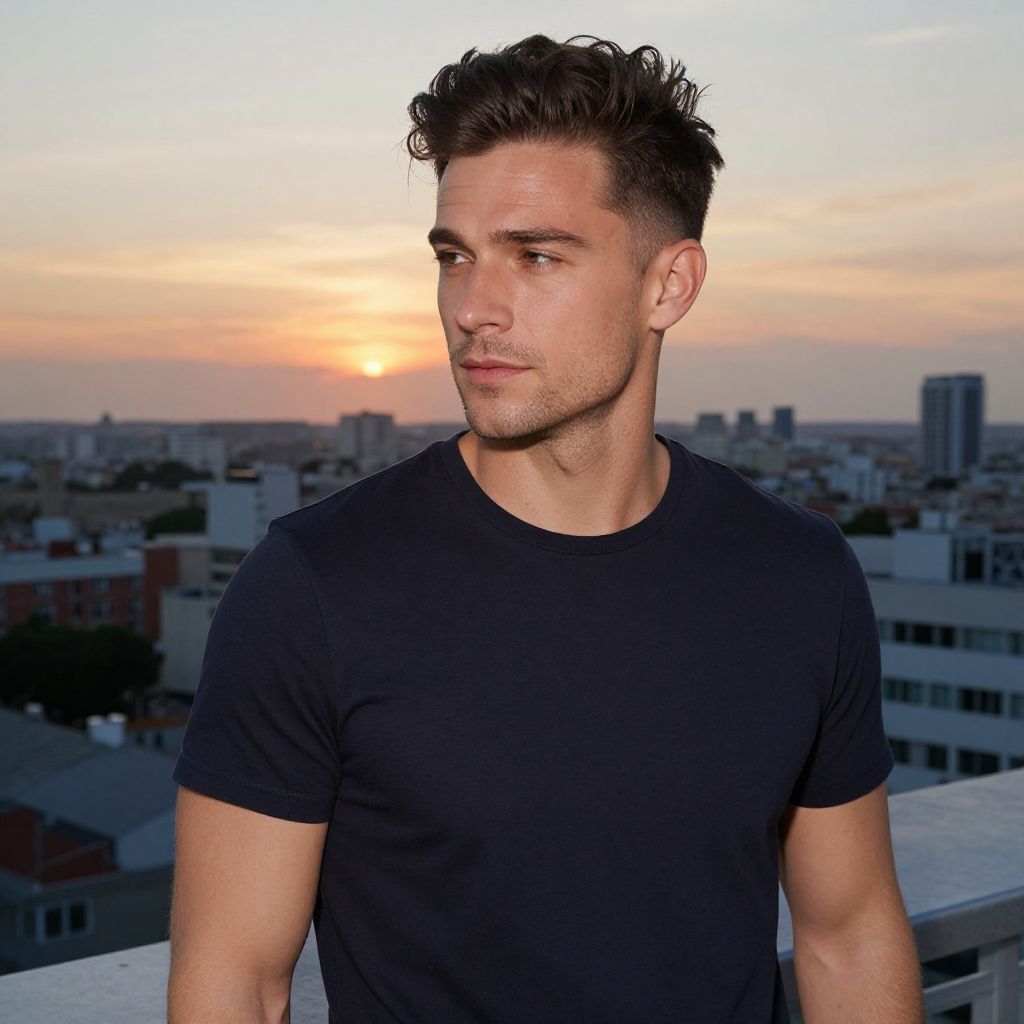 Photograph of a man with short brown hair, wearing a dark shirt, standing in profile on a rooftop at sunset, with a city skyline and sun