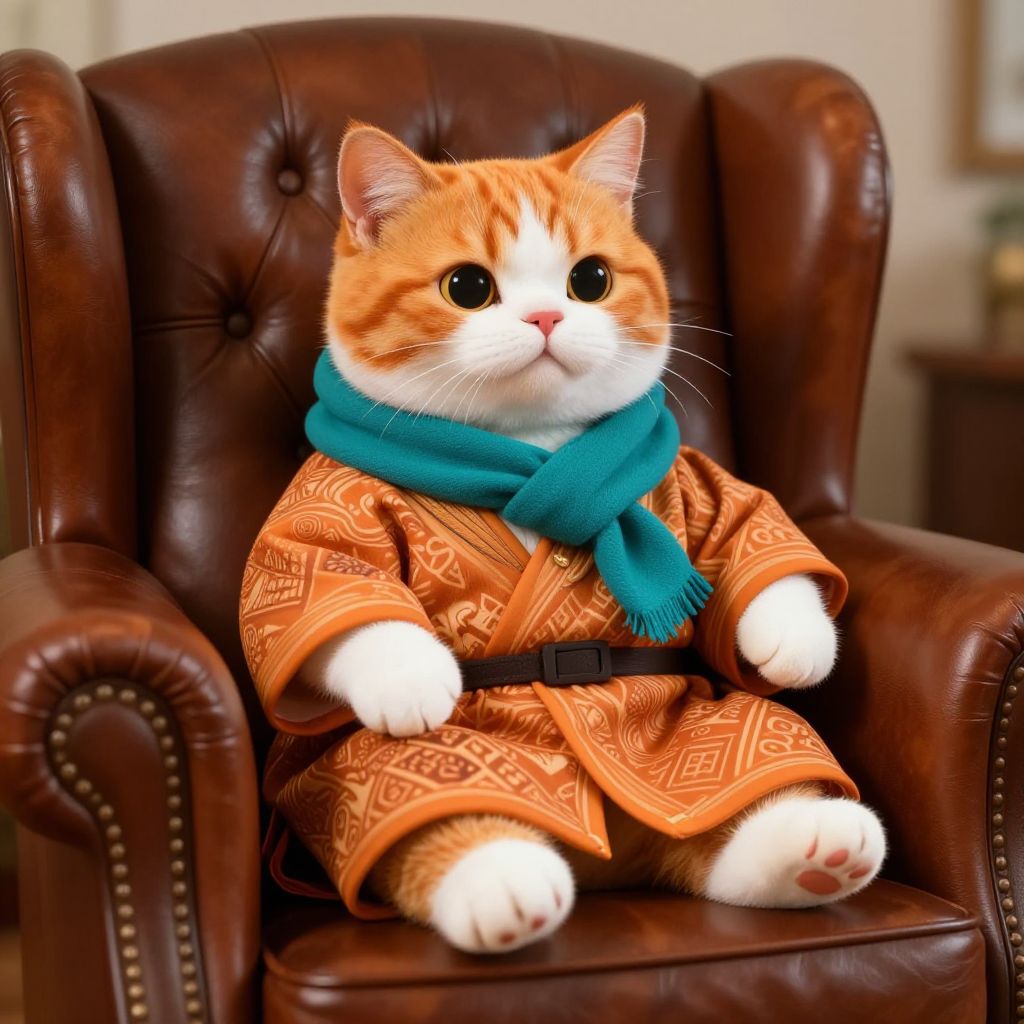Cartoon-style anthropomorphic orange and white cat wearing a patterned robe and teal scarf, seated comfortably on a luxurious brown leather armchair. The scene is illuminated with natural lighting, emphasizing the detailed textures and vibrant colors.