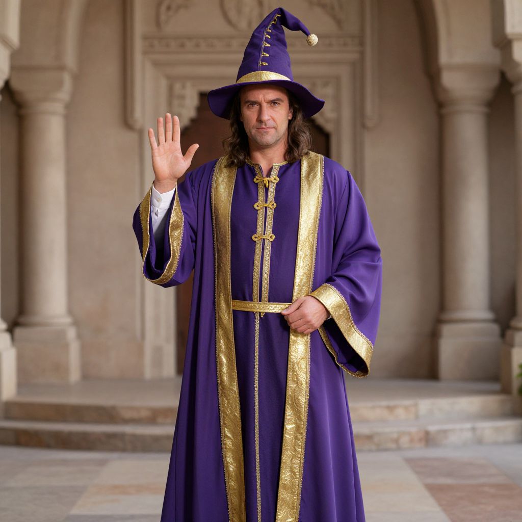 Photograph of a middle-aged man with long brown hair and a serious expression, standing in a grand, stone-columned hall. He is dressed in a medieval-style, deep purple wizard robe with gold trim and a matching pointed hat adorned with a gold emblem. He is waving with his right hand, while his left hand rests on his belt. The robe's fabric appears rich and textured, contrasting with the smooth, beige stone background. The image has a slightly realistic CGI style, enhancing the colors and textures.