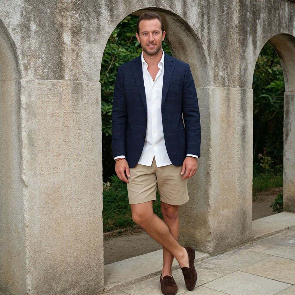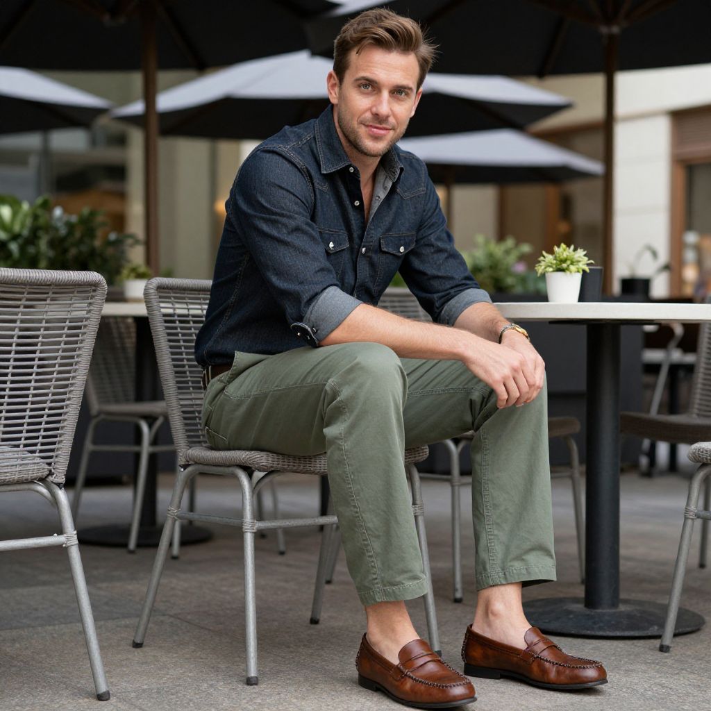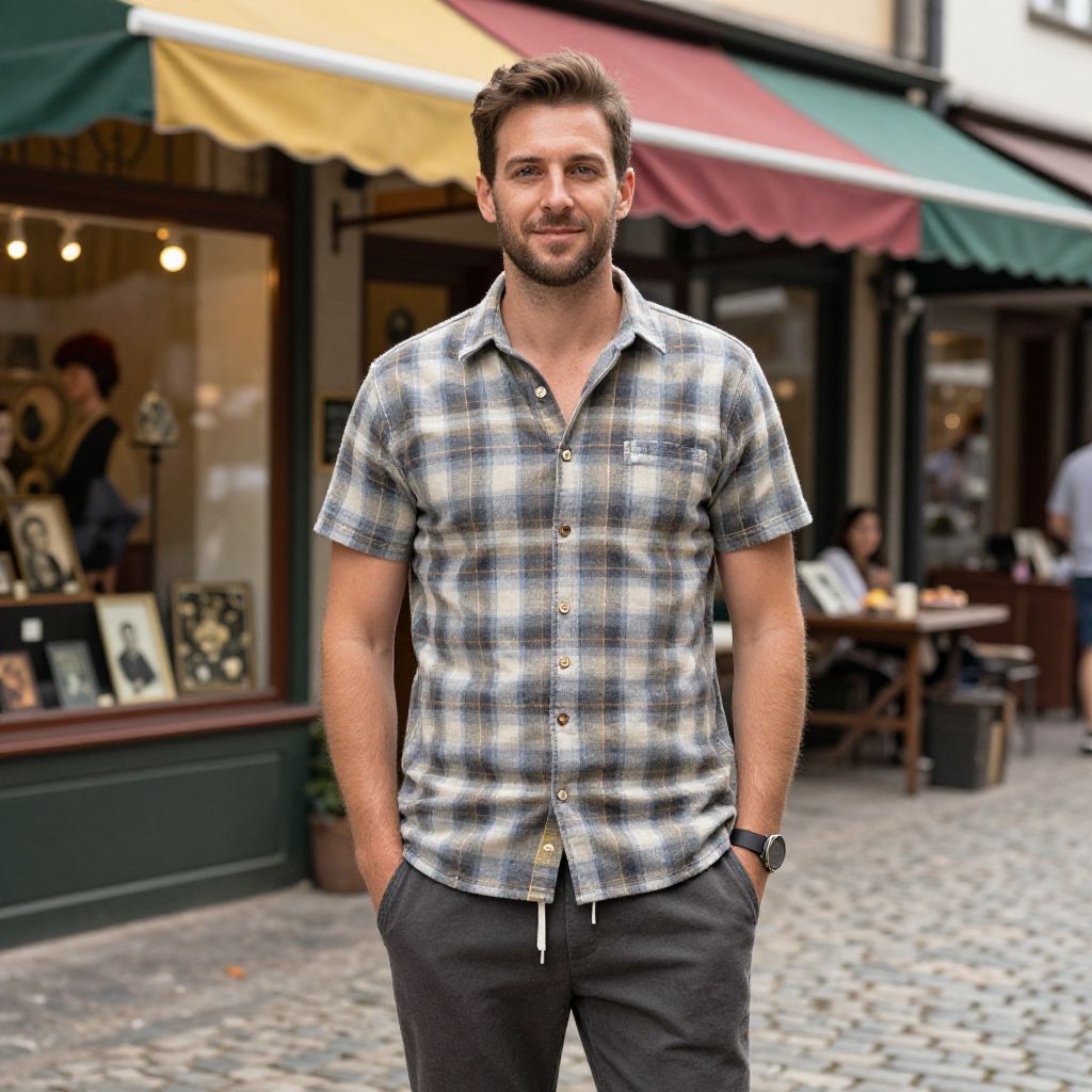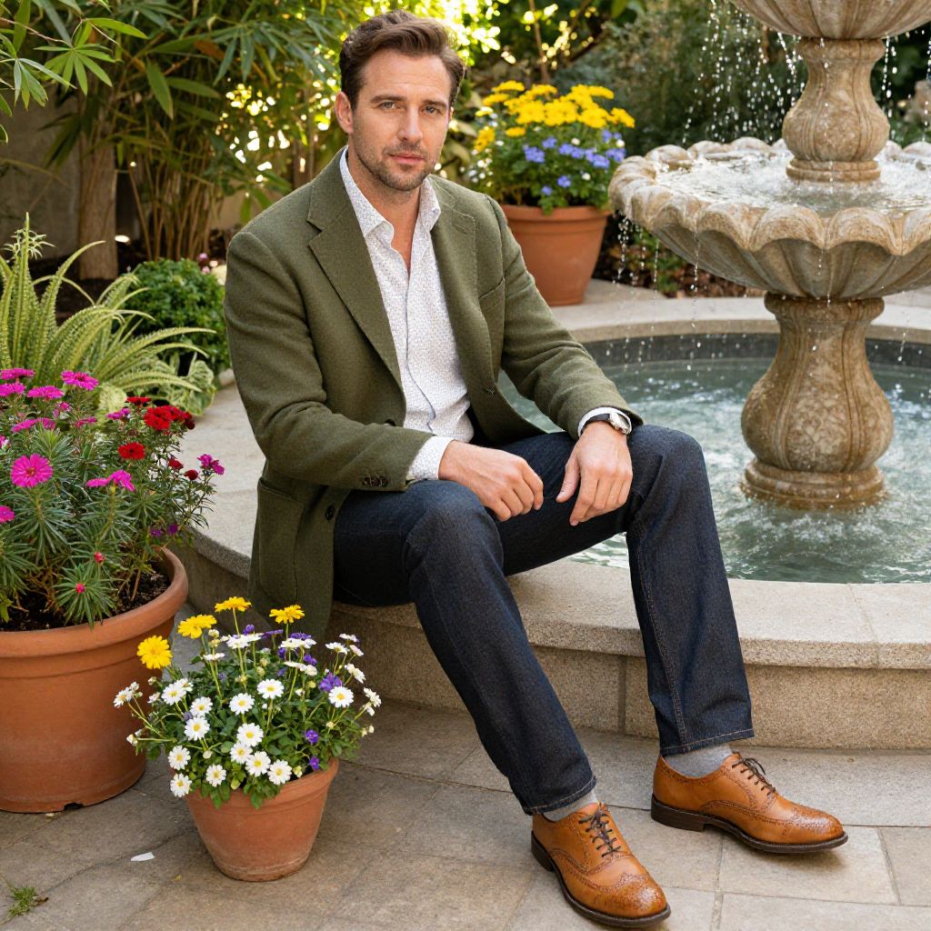 A man, classic denim shirt, charcoal chino pants, tan brogues, polished yet relaxed, charming alpine village, cobblestone paths, colorful flower boxes, kodacolor analog film, thoughtful expression Man has masculine face and piercing eyes
