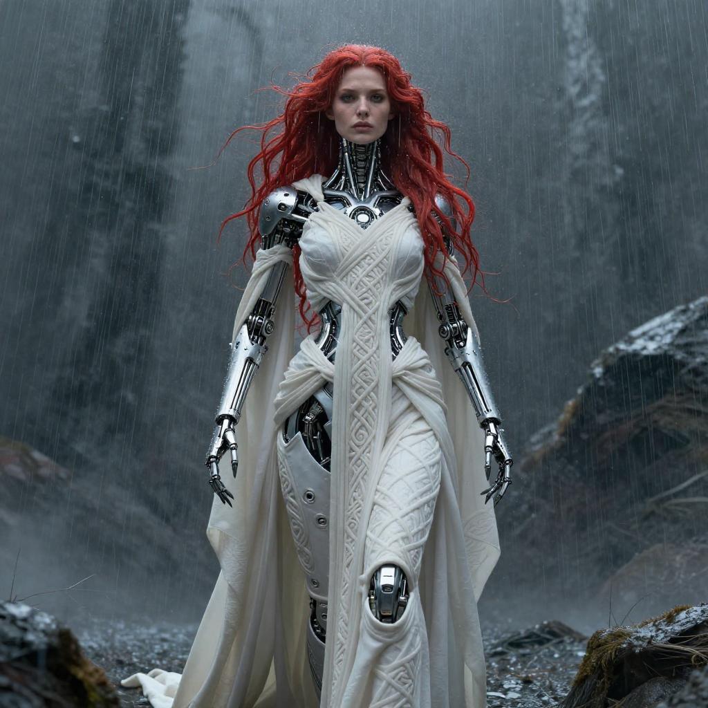 Kavellion style, Beautiful alien machine goddess of the rainstorms in white celtic robes by android jones alex grey m, c, escher h, r, giger android jones alex grey mark cooper alien beauty alien cyborg machine goddess beauty alien celtic red - haired rainstorm goddess with white robes and metallic machine deity alex grey android jones hr giger artgerm artstation award winning photorealistic detailed hypervivid intense fantasy concept art by greg rutkowski
